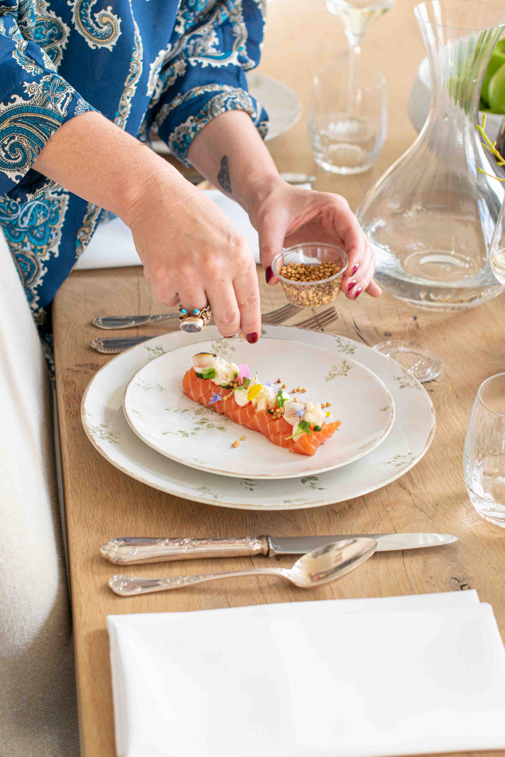 habitudes auprès de la maison pour animer un séjour en chambre d’hôte, pour varier les plaisirs d’un voyage en avions privé, ou pour glamouriser un barbecue lors d’un week-end dans un chalet. Les Ardennes deviennent Aspen, la simplicité a bien le droit d’être un peu sophistiquée. La formule « garde alternée » permet avec moins de lustres mais tout autant de bonheur partagé de se ménager du temps, sans sacrifier à la qualité. Tous les plats sont adaptables selon les goûts et les besoins de chacun, les menus sont flexibles, le luxe abordable, le service gants blancs.