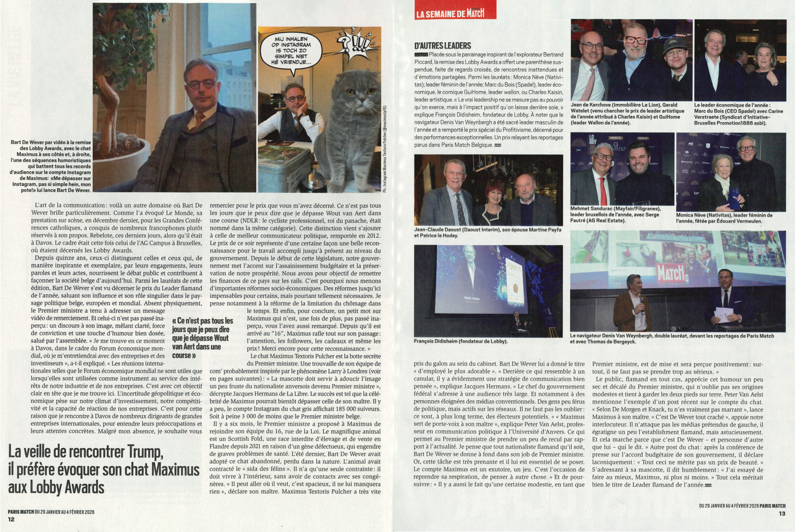 Dans cet article, Paris Match revient sur la présence remarquée de Bart De Wever aux Lobby Awards, où le leader politique s’est distingué par une approche de communication originale, notamment à travers la mise en avant de son chat Maximus. L’article souligne comment cette séquence illustre l’importance croissante de l’image, de l’authenticité et des réseaux sociaux dans la communication politique contemporaine.